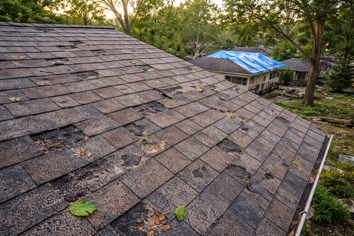 Hail damage on asphalt shingles typically appears as circular impact marks with granule loss, bruising of the shingle surface, or cracking at the point of impact. Damage is not always visible from the ground and requires a proper roof inspection by a qualified contractor. HKM provides free roof inspections for homeowners across the DFW area to assess whether storm damage warrants an insurance claim.